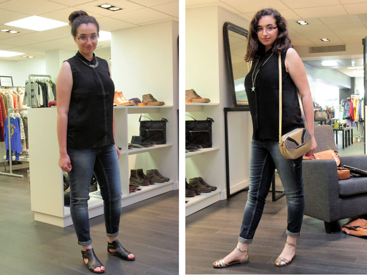 Amel s'essaie maintenant à l'exercice du jean et de la chemise noire. La rédac' Mode lui montre qu'avec ces deux pièces basiques, elle peut s'offrir deux styles : un rock avec sandales noires et collier porté sur un col boutonné jusqu'en haut. Et un autre plus décalé, avec un sac et des sandales dorées et un pendentif étoile. Amel est séduite !