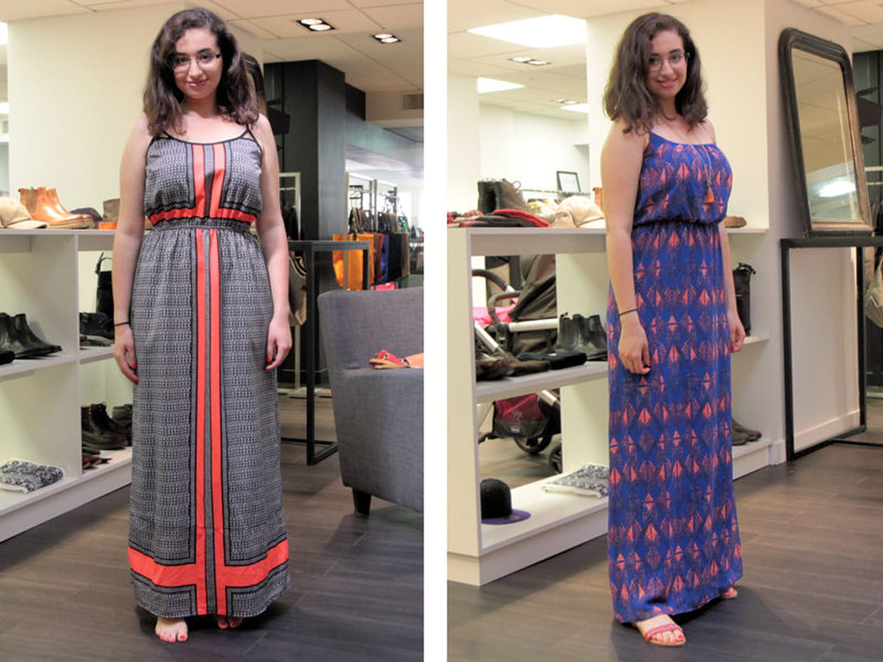 Amel ne porte jamais de robe longue mais avait craqué pour ce modèle très graphique orné de bandes fluo. Cependant, après essayages, c'est bien l'autre robe imprimée qui sied mieux à sa silhouette. Adjugée !
