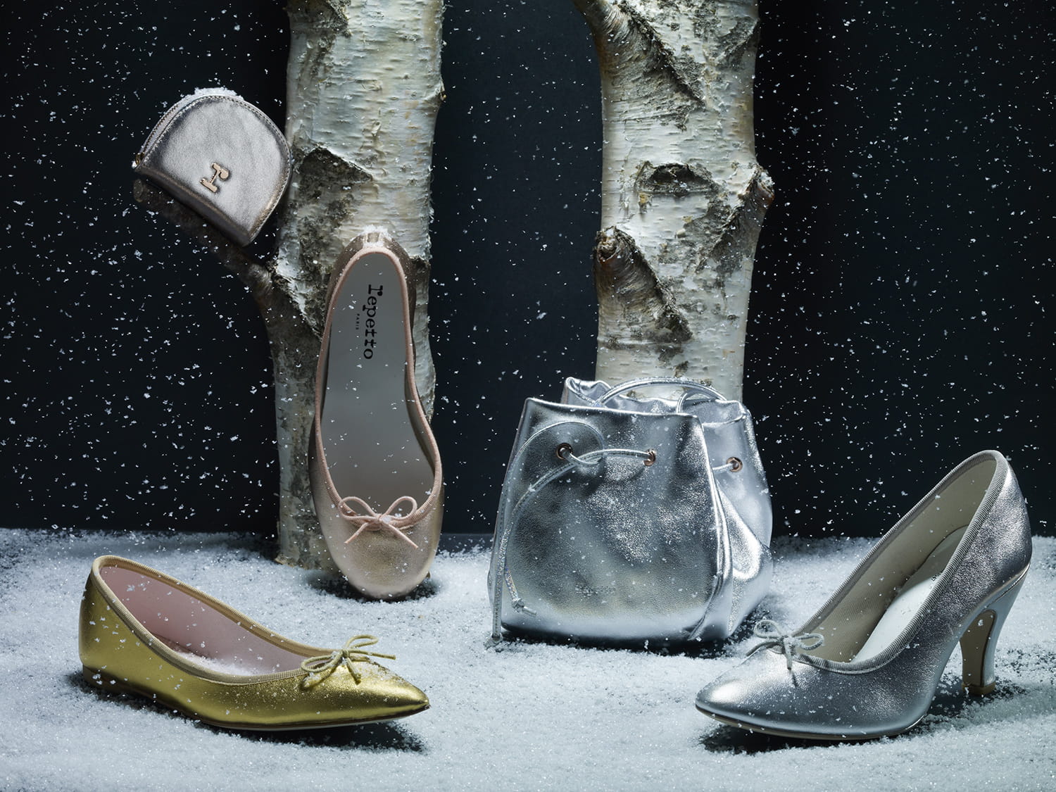 Les portraits qui composent cette collection sont une invitation au rêve : justaucorps, tutus pointes, maroquinerie et chaussures se prêtent au jeu sous des tonalités d'or, aluminium, noir ou encore lurex. La collection de Repetto se retrouve dans les vitrines, les boutiques et sur le site internet de la marque pour un moment magique à partir du 15 novembre 2014.