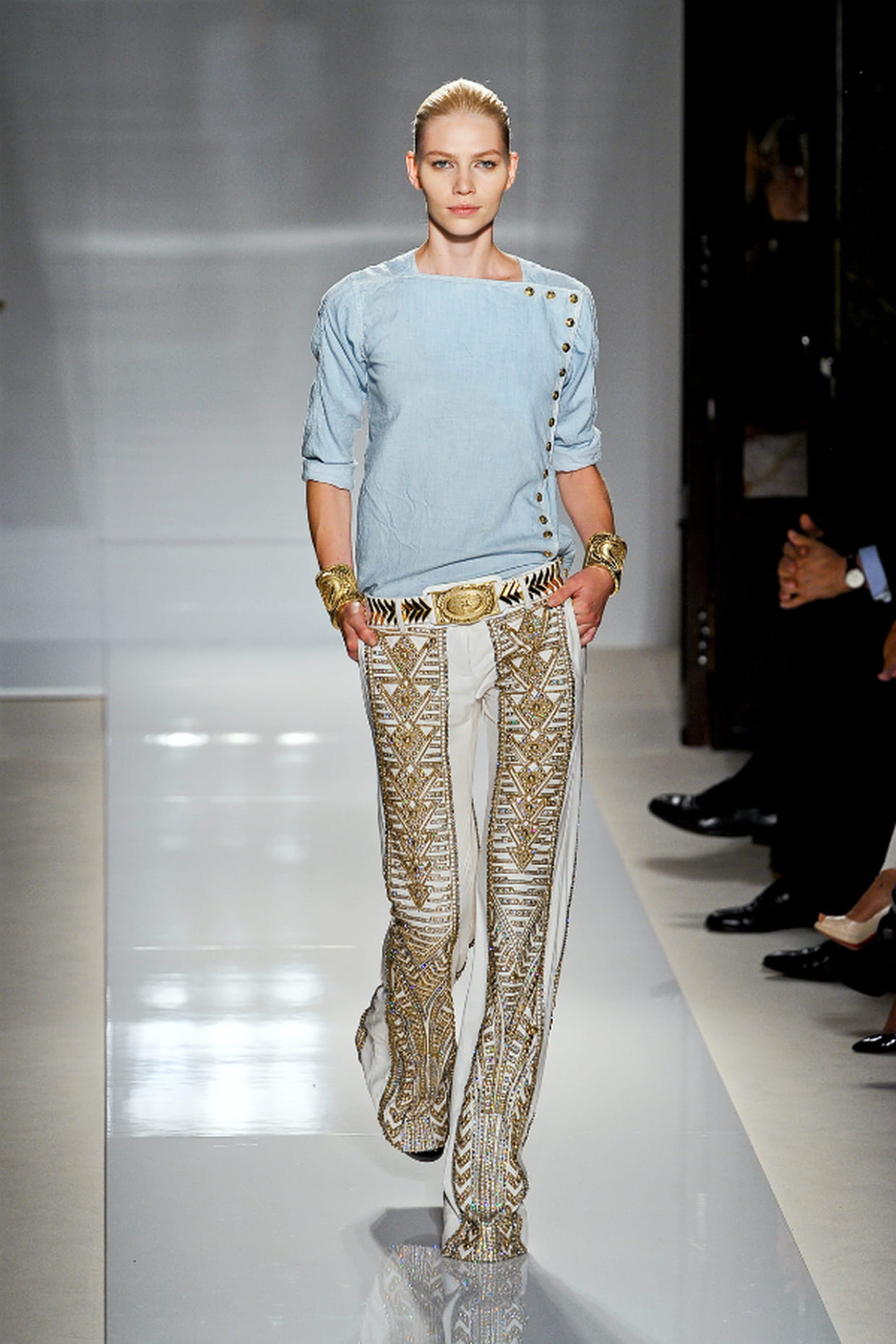 Les broderies de perles, dessinant des motifs ethniques géométriques sont chères à Olivier Rousteing, qui les revisite régulièrement et les appose sur une multiude de pièces comme sur ce pantalon issu de la collection printemps-été 2012. Par touches ou en all-over, dorées ou argentées, ces broderies précieuses font désormais la signature de Balmain et ont de fortes chances de se retrouver sur les vêtements H&M x Balmain.