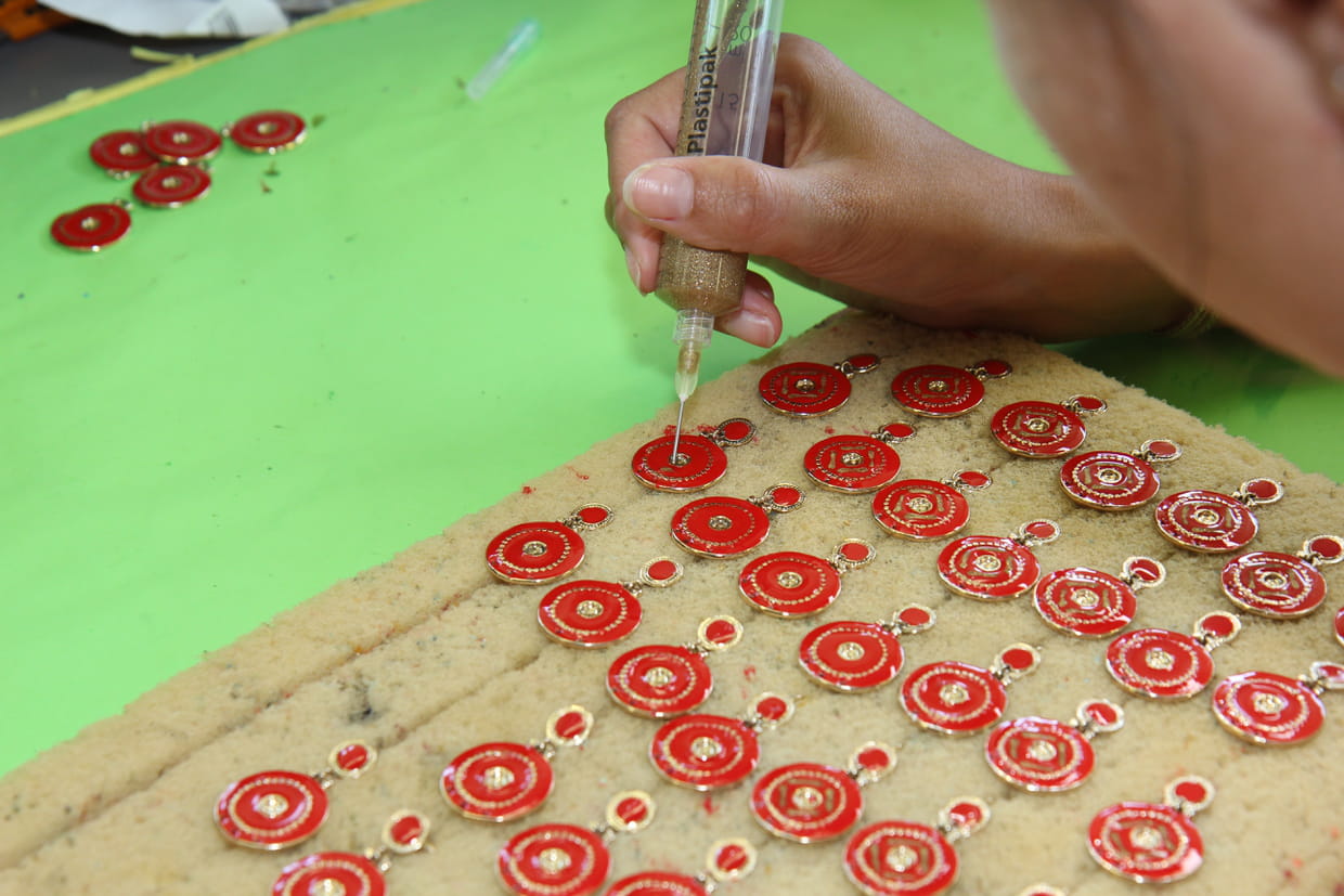 Une fois la mixture préparée par les soins de l'artisan coloriste, on peut procéder à la coloration des bijoux par l'émaillage. Cette étape minutieuse demande de la dextérité et une grande patience : à l'aide d'un piston relié à la seringue, l'artisan pose délicatement la matière sur le bijou. Parce que ce procédé est réalisé à la main, chaque bijou est unique tout en ressemblant à ses pairs.