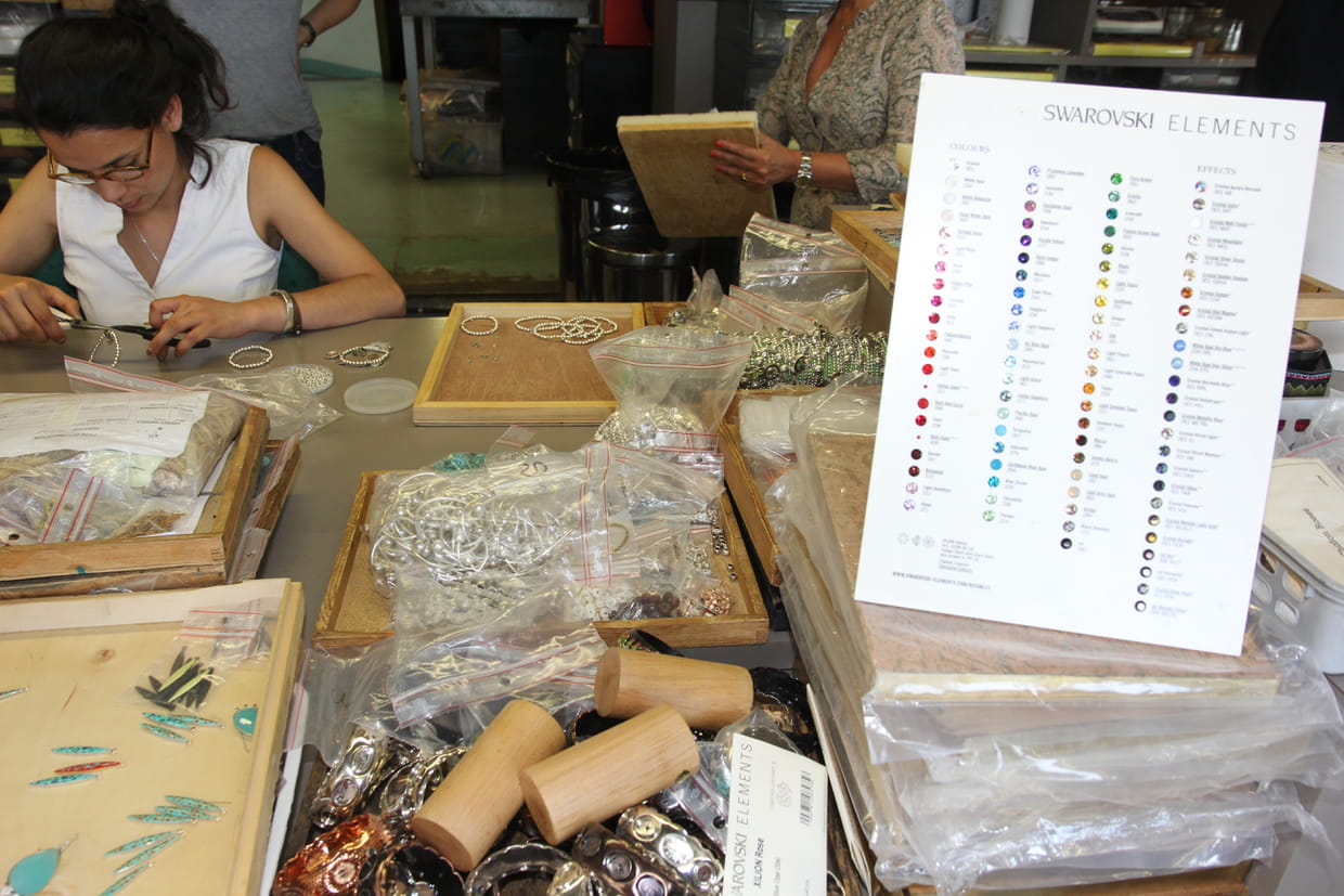 Les bijoux de la maison Gas ne seraient rien sans les matériaux de qualité employés pour les confectionner. Parmi les nombreux fournisseurs de la marque, Swarovski pour ses strass colorés, déclinés à l'infini et qui rentrent dans la fabrication de nombreux bijoux fantaisie. Dans l'atelier, un panneau permet d'avoir une vue d'ensemble des cristaux proposés, permettant ainsi aux artisans d'imaginer leurs propres combinaisons de couleurs lorsque l'heure est à la recherche d'idées. D'ailleurs, de nombreux documents et livres sont mis à la disposition des ouvriers pour leur permettre de trouver des inspirations ici et là et ainsi stimuler leur inventivité.