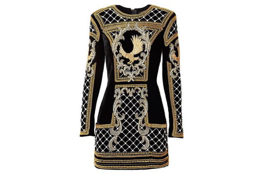Fidèle à l'ADN de la maison Balmain, cette dernière possède de nombreux détails ultratravaillés ; il s'agit d'une robe noire à manches longues en velours de soie, brodée de fils métalliques dorés et ornée de perles et de strass. Un véritable bijou, qui sera en vente au prix de 499 euros d'après le magazine Elle.