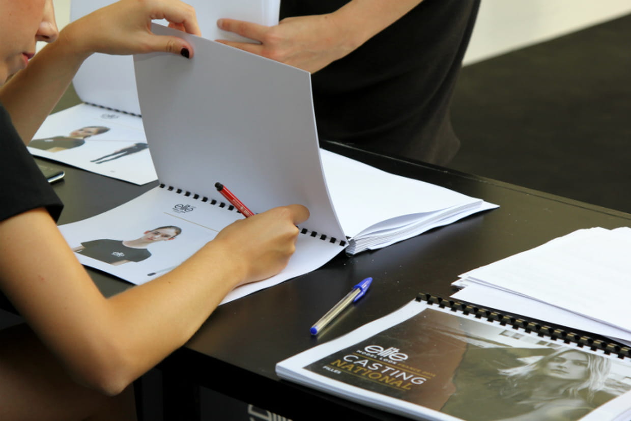 Les jurés jettent un dernier coup d’œil au book, sur lequel sont listées les soixante-quatre filles sélectionnées pour passer la deuxième phase de casting Elite. A leur nom, prénom, âge et mensurations s'ajouteront leurs annotations personnelles. "En plus des critères d'âge et de taille, on va regarder la démarche, l'allure, la silhouette, la beauté naturelle, mais également la photogénie qui est un critère extrêmement important", confie Victoria Da Silva, présente au côté d'un jury de professionnels Elite.