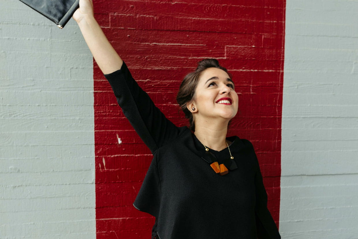 "Pour mes looks sélectionnés, j’ai tout d’abord porté une petite jupe moutarde courte et évasée avec une tunique noire col V à dos en dentelle, les deux de chez Grace & Mila, et des derbies bi-matières très originales signées Vanessa Wu. En accessoires, nous avons choisi un sublime collier en bois noir et camel de la marque Salomé Charly et une pochette Vagabond : je suis emballée par cette tenue, trouvée sur le Who's Next et le salon Première Classe, à laquelle j’ai immédiatement adhéré et que j’ai hâte de reporter" nous a expliqué Cécile.