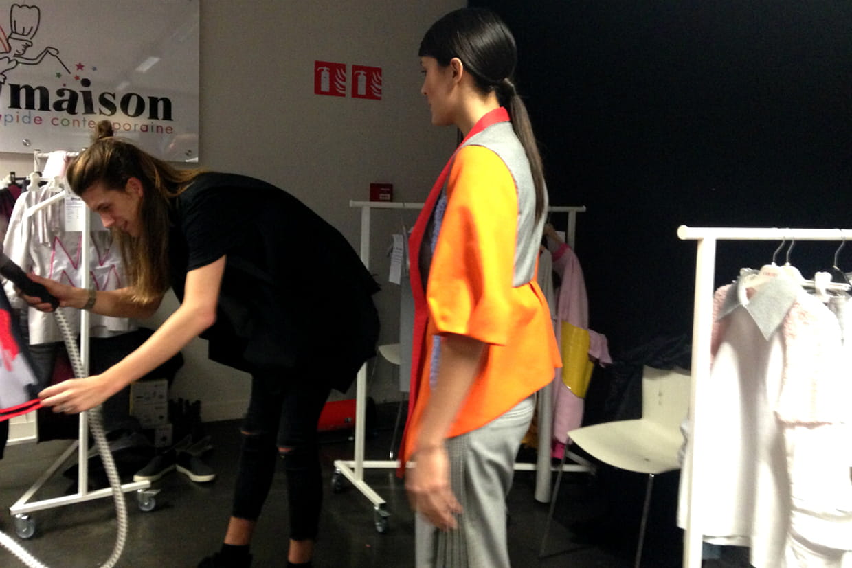 Les étudiants s'affèraient encore quelques minutes avant le défilé. Comme pour les vrais pro, chaque détail compte et l'on surprenait Gaëtan Vanlaere du groupe Effusion en pleine séance de repassage, soucieux que le rendu de sa collection soit impeccable.