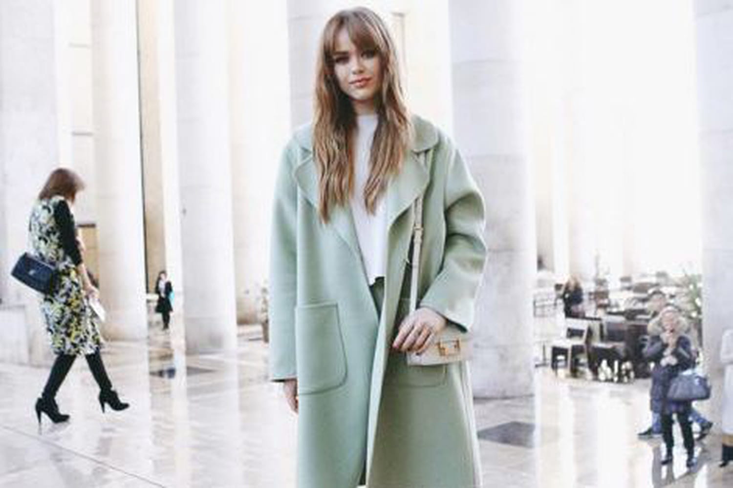 Sous son manteau couleur vert d'eau, accordé à son pantalon fuselé, l'égérie digitale de Mugler est tout simplement parfaite. Chic et tendance à la fois, elle opte pour la sobriété en accordant la teinte pastel à un top uni et des accessoires immaculés. Tandis qu'un mini it-bag rectangulaire vient se nicher sous son bras, d'impeccables stilettos féminisent l'ensemble de la tenue.