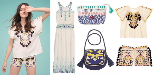 - Nos pièces coup de cœur : la robe brodée à 79 euros, le sac bleu en coton avec anses en cuir et rabat bordé de perles à 59 euro, le top brodé à 35 euros, le short brodé à 79 euros, la pochette brodée à 15 euros.