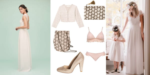 - Nos pièces coup de cœur : la robe de mariée en soie et dentelle à 280 euros, la veste brodée à 75 euros, l'ensemble soutien-gorge triangle et culotte à 28 euros et 18 euros, la pochette brodée à 19 euros, le sac sceau brodé en perles à 39 euros, les escarpins pailletés dorés en cuir à 65 euros.