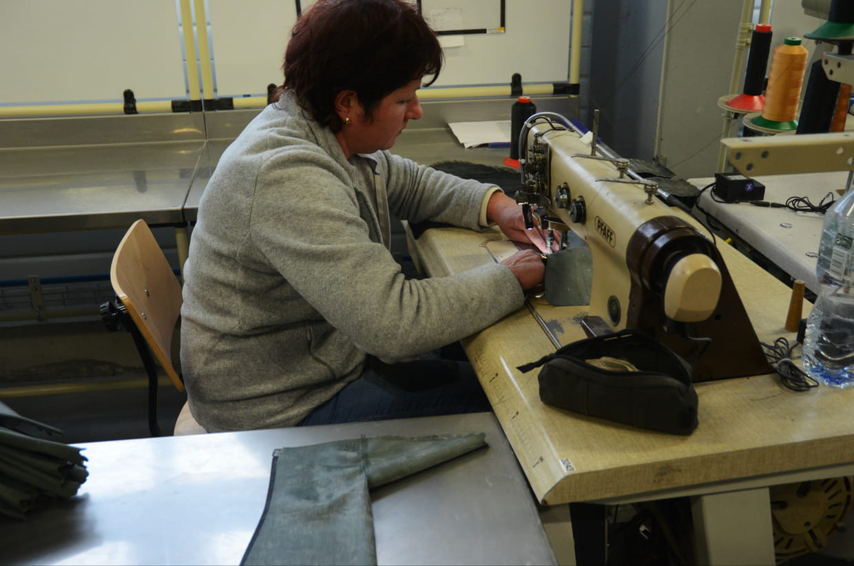Pour le montage sur chaussette, la matière, composée d'une couche de polyamide intérieure et d'une couche de caoutchouc extérieure est cousue et fermée à la surjeteuse.
