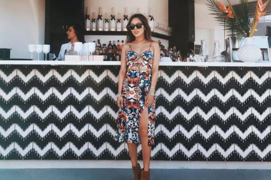 Cette semaine, la jeune femme a brillé sous le soleil californien en se la jouant bohème chic. Loin de la flopée de costumes importables remarquée au cours de l’événement, la tenue de la belle est abordable et nous donne envie de lui chiper. Lunettes de soleil sur la tête, la fashionista se pare d'une robe ajourée florale signée Revolve. Moins sage qu'elle n'en a l'air, la pièce arbore une fente qui libère les jolies gambettes de la modeuse. Celle-ci accompagne sa toilette d'une paire de boots camel à talons carrés en plein dans la tendance gypset.