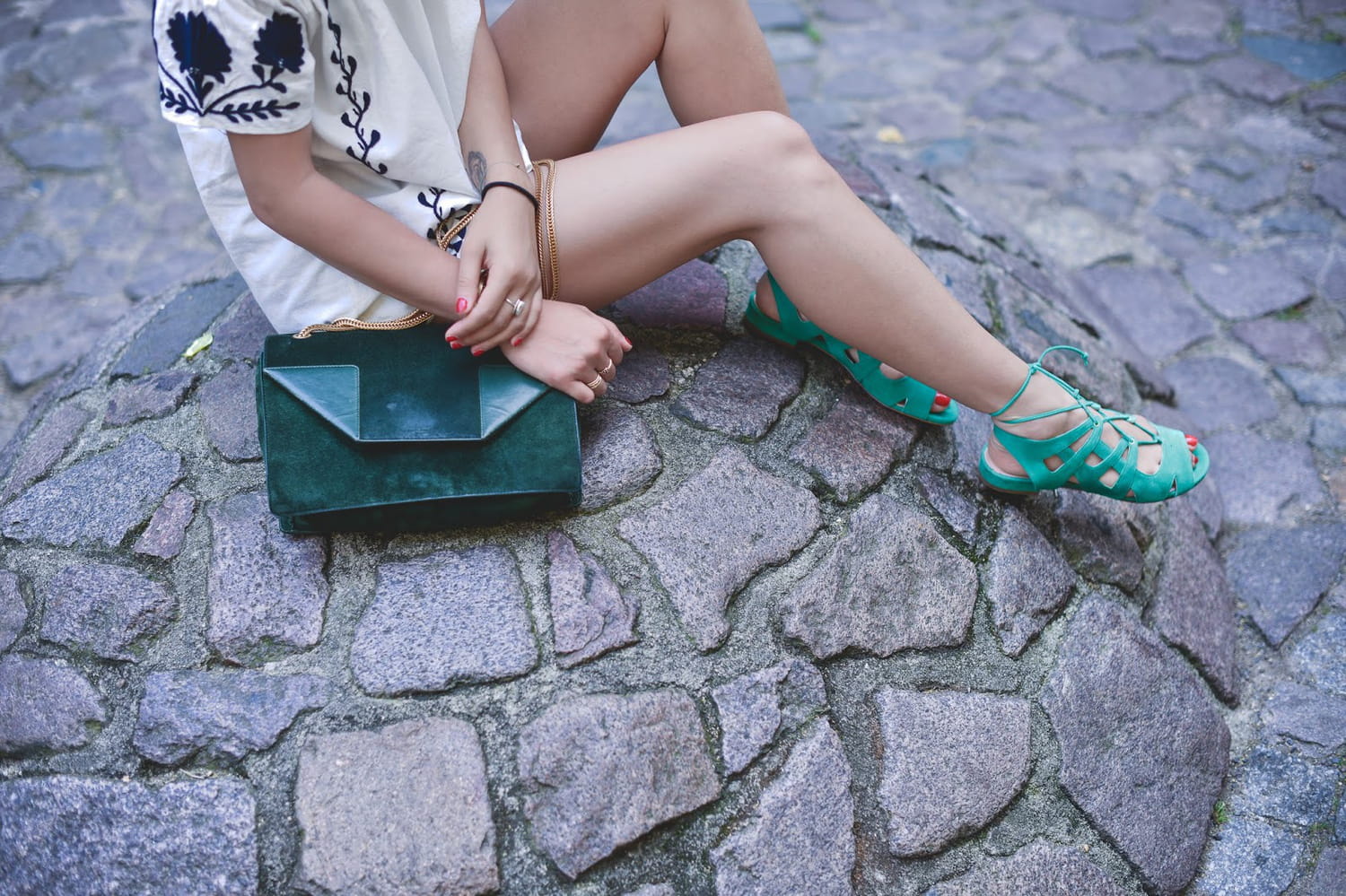 Pièce maîtresse de la tenue, le top Sézane de la belle allie deux grandes tendances de la saison, à savoir la blouse roumaine, et l'encolure Bardot. Les broderies végétales bleu marine s'accordent à la perfection au blanc du chemisier, et le décolleté permet à Leeloo de découvrir ses épaules de manière très élégante. Portée comme une mini-robe, la blouse folk laisse apparaître un short en jean Levi's dont les ourlets font entrevoir les poches, et ajoutent un côté casual et loose au look. Pour les chaussures, la fashionista mise sur le vert avec des sandales lacées Minelli X Georgia May Jagger, en plein dans la saison.