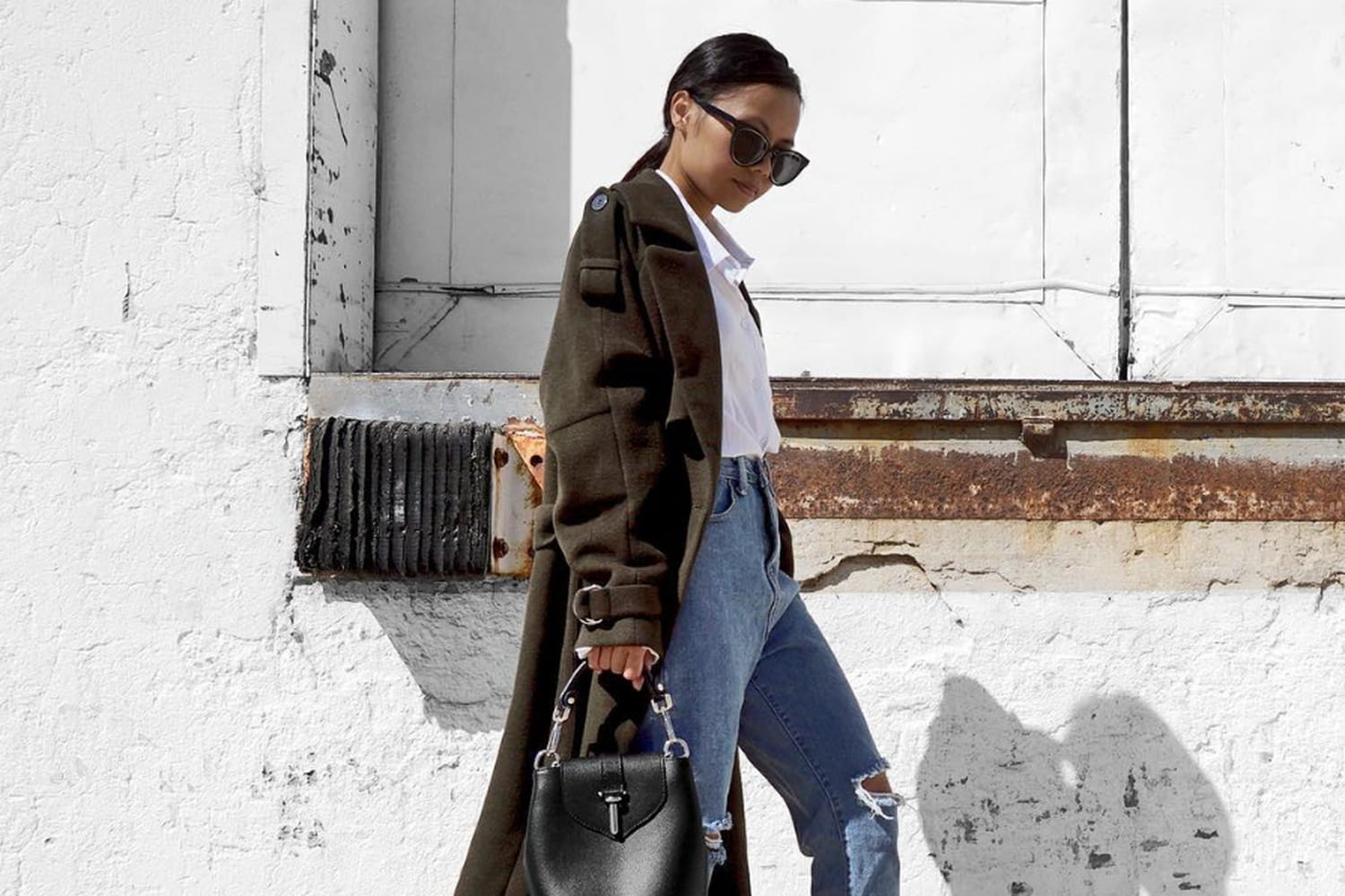 Californienne jusqu'au bout du Starbucks, la jeune femme d'origine asiatique déploie sur son compte Instagram un défilé de looks plus léchés les uns que les autres. Son mot d'ordre ? "Less is more" en matière d'allure comme de charte graphique. Du coup, c'est sur un fil épuré et lumineux que l'on retrouve ses OOTD quotidiens, toujours aussi simples que chics. Et l'irruption d'un jean déchiré dans son flux ne bouleverse rien de cette épure fascinante, bien au contraire. Chinda Phraph choisi LE jean de la saison, de coupe "mom", plutôt taille haute et plutôt droit mais ample, déchiré, et, cerise sur le gâteau, coupé façon bord franc en bas. Avantage de cette coupe "cropped", la belle peut glisser une paire de bottines chaussettes vernies noires dessous, sans se soucier du raccord entre le bas du pantalon et le haut de la chaussure. Autour de ce jean de caractère, la blogueuse n'a qu'à rester sobrement élégante et la magie opère : une chemise blanche, un manteau officier revisité et un sac seau complètent la tenue. Un cocktail de tendance et de bon goût minimaliste dans lequel le jean révèle toutes ses arômes savoureuses.