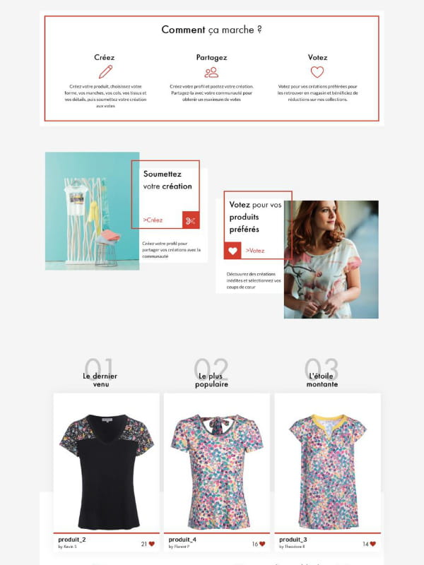 • Quoi : Une solution pour proposer aux marques de créer leur propre plateforme de co-création, sous la forme d'un site web dédié et personnalisable. Chaque marque peut ainsi inviter sa communauté à venir créer des produits et voter pour ses modèles favoris. À la fin de la campagne, la marque sélectionne parmi les produits les plus appréciés ceux qu'elle souhaite intégrer dans ses collections. Les produits créés et approuvés par la communauté se retrouvent alors commercialisés.