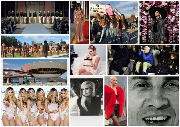 Cette année, la mode a tout d'abord été endeuillée par les décès successifs de grands noms tels qu'André Courrèges en janvier, le photographe de streetstyle Bill Cunningham en juin, et bien évidemment celui de Sonia Rykiel en août. Si le défilé hommage à la Reine du Tricot a attiré l'attention du monde entier, ce n'est pas le seul. En tête de file des shows les plus commentés, Yeezy 4 mené par Kanye West obtient la palme du bad buzz, tandis que le titre de décor le plus fabuleux revient ex æquo à la Croisière de Louis Vuitton à Rio, au défilé haute fourrure de Fendi à la Fontaine de Trevi et à Chanel Métiers d'Art au Ritz Paris. La capitale française était d'ailleurs sous le feu des projecteurs mode en accueillant le défilé de lingerie Victoria's Secret pour la première fois, et en fêtant les 100 ans d'Etam lors d'un Live Show événement.