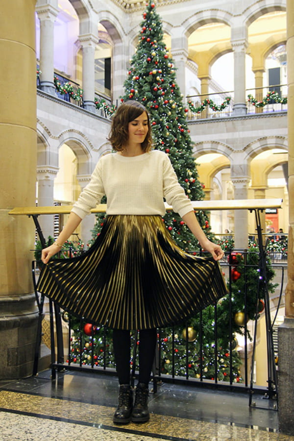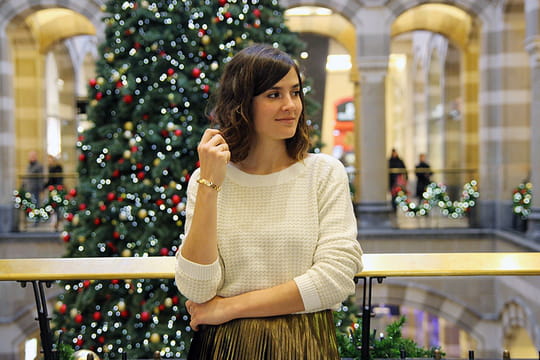 Cette semaine, Victoria du blog Margot & Salt a relevé ce défi haut la main avec une tenue pratique et trendy. Posant devant un immense sapin vert, la jolie Amstellodamoise d'origine française ferait presque de l'ombre au roi des forêts. Surmontant un pull-over blanc texturé plutôt classique, une jupe plissée noire et dorée vient illuminer l'allure de l'influenceuse aux plus de 82 000 abonnées sur Instagram. Cerise sur la bûche, Victoria fait le choix audacieux d'une paire de boots motardes qui créent un contraste réussi. Christmas is in the air !