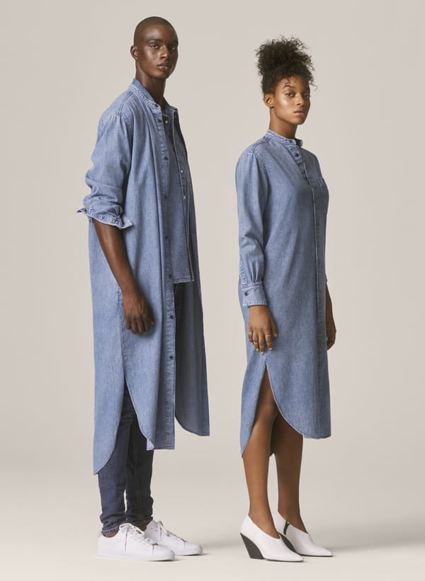 "Denim United" est donc un dressing mixte autours du blue jean proposant des pièces oversize et minimalistes, avec une nette inspiration nineties, réalisé dans des cotons biologiques ou recyclés mais aussi en lyocell, matière star de la mode écolo.