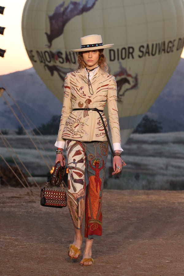 Calamity Jane aurait été comme un poisson dans l'eau au défilé Croisière 2018 de Christian Dior. À Los Angeles, Maria Grazia Chiuri présentait sa nouvelle collection au sein de la maison de couture. Décidément, le nom de Dior est partout en ce moment, de la côte Ouest au Musée des Arts Décoratifs de Paris. À L.A, dans le parc naturel Upper Las Virgenes Canyon Open Space Preserve, c'est toute une armée de cow-girls qui a occupé le podium, chapeaux de western sur la tête. Dans un décor désertique où des tentes berbères avaient été installées, les tops défilaient dans des tenues inspirées des habitantes des villes du Far West et des indiennes d'Amérique de l'époque. Robes esprit peaux de bêtes et peintures rupestres pour les unes, vestes cintrées et jupes longues strictes pour les autres, la griffe nous emmenait en plein "revival" de l'ère des peaux rouges et des visages pâles.