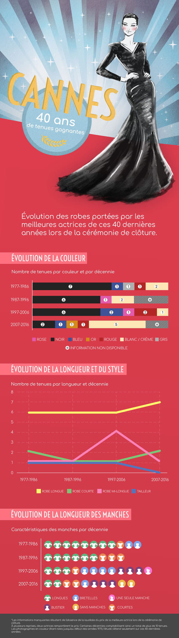 Depuis sa naissance, le Festival de Cannes n'a jamais cessé de voir défiler les plus belles tenues sur son tapis rouge. On se souvient tous de la robe cygne de Bjork ou des robes sublimes de Sophie Marceau. Au fil des années, les robes des stars se sont colorées, allongées ou raccourcies, ont changé de forme. À l'occasion de la 70 ème édition, une infographie répertorie toutes ces évolutions. Le site ShopAlike a analysé les tenues portées sur les marches ces 40 dernières années. Résultat : les looks des actrices au Festival de Cannes n'ont jamais été aussi variés que de nos jours. Si les robes longues sont toujours aussi plébiscitées, leurs couleurs sont quant à elles beaucoup plus diversifiées, prenant le pas sur les modèles en majorité noirs arborés dans les années 80/90. La mode touche aussi les manches, qui d'années en années, diminuent pour se transformer en bretelles, bustier ou n'en garder qu'une seule. Une infographie qui donne envie de se parer des plus belles robes de soirée.