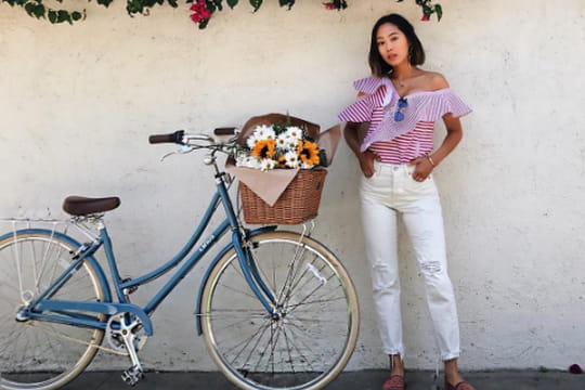 Pour Aimee Song, l'été, c'est tous les jours. Pas étonnant quand on vit en Californie. Mais pour nous, c'est surtout une belle inspiration pour anticiper nos looks de la saison. Celle-ci nous régale quasi-quotidiennement de tenues toujours plus réussies. D'ailleurs, qu'y a-t-il de mieux qu'un joli top découvrant une épaule pour profiter des beaux jours ? La fondatrice du blog Song of Style nous le confirme avec son modèle signé Self-Portrait. L'Américaine l'a choisi à volants pour le côté aérien et à rayures irrégulières blanches et rouges. C'est surtout la façon qu'elle a de le porter qui nous donne envie d'imiter son style. La Californienne a choisi de le rentrer dans un jean immaculé légèrement déchiré coupé au-dessus de la cheville. Pour garder un esprit casual, c'est une paire d'espadrilles Chanel, elles aussi rayées de blanc et de rouge et à bout bleu, qu'a décidé d'arborer notre blogueuse. Un look qui se révèle rafraîchissant, accompagné de discrets bijoux dorés. Le style à la californienne est définitivement la bonne recette mode du moment.