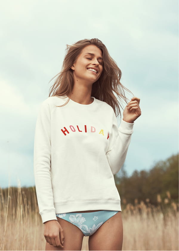 Douze pièces essentielles du dressing estival auront suffit à faire de la collab' Sézane X Holiday l'une des plus réussies de la saison printemps-été 2017. Douze pièces bien choisies, parfaitement coupées et décontractées qui nous font prendre le large grâce à leur esprit rétro californien pile dans la tendance. Dès le 14 juin, on retrouvera donc sur l'e-shop une jolie collection comprenant quatre t-shirts blanc à message brodé (bleu, rose ou rouge) ou imprimé, un sweat-shirt, deux chemises (en version blanche ou rayée bleu, blanc, rose), un jean coupe mum, un short taille haute et deux bikinis triangles pastel (imprimé hawaïen bleu ciel et blanc ou nid d'abeille jaune pâle).