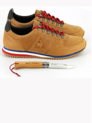 • Quoi : une box composée d'une paire de baskets "Turbostyle" à l'esprit montagnard en cuir camel et d'un couteau Opinel N°8 avec sa manche en bois gravée