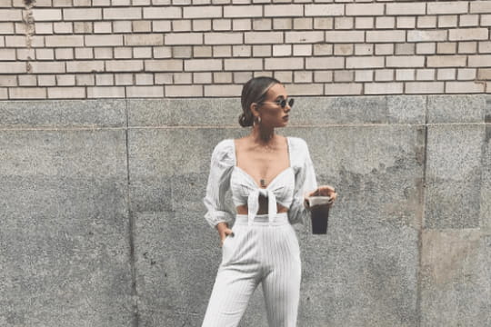 On a beau se réjouir en se disant que l'été est là, le beau temps ne suit malheureusement pas toujours. La météo ne semble pas non plus épargner Los Angeles, où se trouve Danielle Bernstein, fondatrice du blog We Wore What. Loin de se laisser abattre par la chute du mercure, l'influenceuse préfère afficher sur Instagram un look d'été parfait pour les températures plus fraîches. C'est en ensemble blanc strié de fines rayures noires signé Stone Cold Fox que l'Américaine choisit de s'habiller. Le haut, un cropped top noué à manches longues, s'inscrit pile dans la tendance du moment grâce à son esprit cache-cœur. Le pantalon respecte lui aussi les codes du printemps-été 2017 en s'arrêtant, évasé, au-dessus des chevilles. Rien de tel pour couronner le tout qu'une paire de ballerines Céline à bouts aussi pointus que le style de leur propriétaire. Voilà Danielle Bernstein prête à montrer patte blanche.