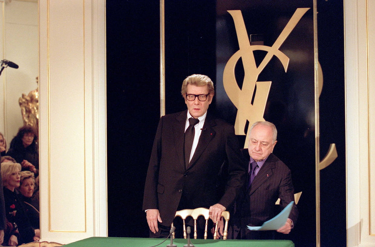 Yves Saint Laurent et Pierre Bergé le 7 janvier 2002 lors de la conférence de presse annonçant la fin de carrière du couturier