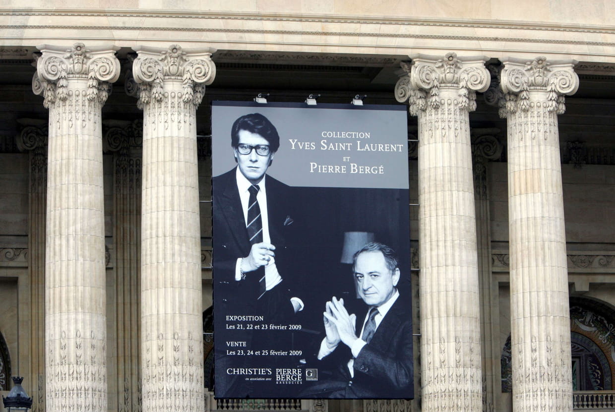 Photo d'archive de Yves Saint Laurent et Pierre Bergé sur la façade du Grand Palais à Paris le 20 février 2009 lors de l'exposition retraçant le travail du couturier