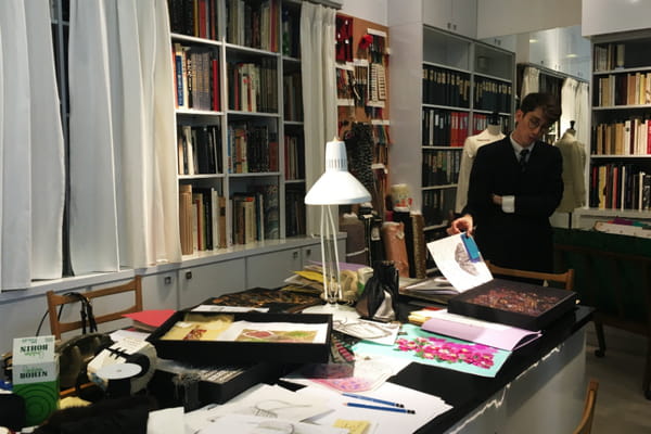 Rendez-vous au premier étage pour franchir le pas du jadis impénétrable studio de création. Des croquis aux échantillons de boutons en passant par les lunettes et les bibelots personnels placés sur le bureau du couturier (celui-là même qui l'accompagne dès 1962), la pièce rectangulaire semble être restée intacte. Le secret d'un tel réalisme ? Le musée a fait appel à d'anciennes assistantes pour recréer le studio, écrin de l'effusion créative de la maison. "C'était émouvant de voir à quel point elles se prenaient au jeu, elles ont même cherché chez elles des archives et apporté des éléments : un croquis, un répertoire qui a été utilisé à l'époque". relate Olivier Flaviano. Alors que les deux acteurs majeurs de cette épique aventure de mode nous ont aujourd'hui quittés, dans le reflet du grand miroir, on ne s’étonnerait pas de voir apparaître Yves Saint Laurent et Pierre Bergé.