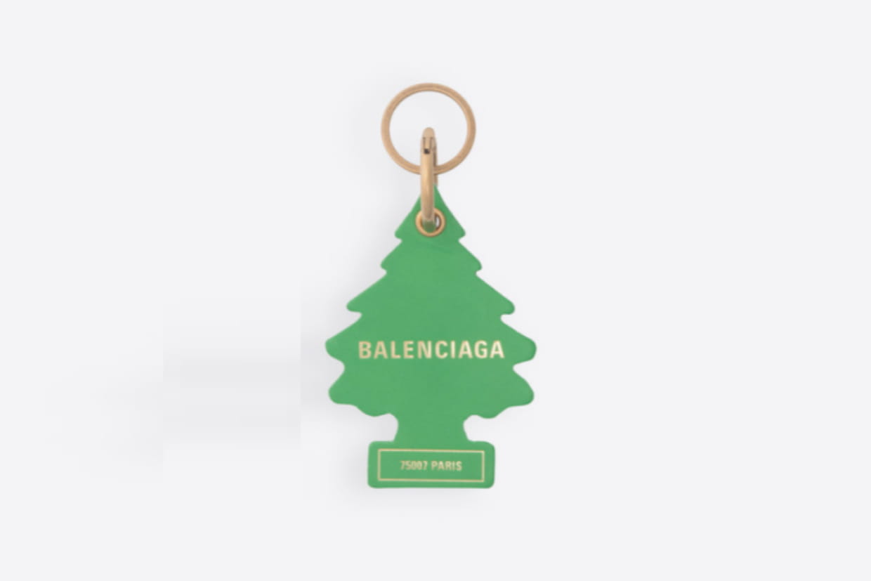En quête permanente de détournement, le regard de Balenciaga se pose sur le célèbre sapin désodorisant qui se balance sur les rétroviseurs des voitures depuis des décennies. En résulte ce porte-clé, parfaite illustration du luxe quotidien de la griffe. Seulement à force de flirter avec les références populaires, la griffe semble avoir oublié que tout ne tombe pas dans le domaine publique. Freshner Corporation, le marque qui produit le sapin "sent bon" poursuit la marque pour contrefaçon. L'arroseur arrosé.