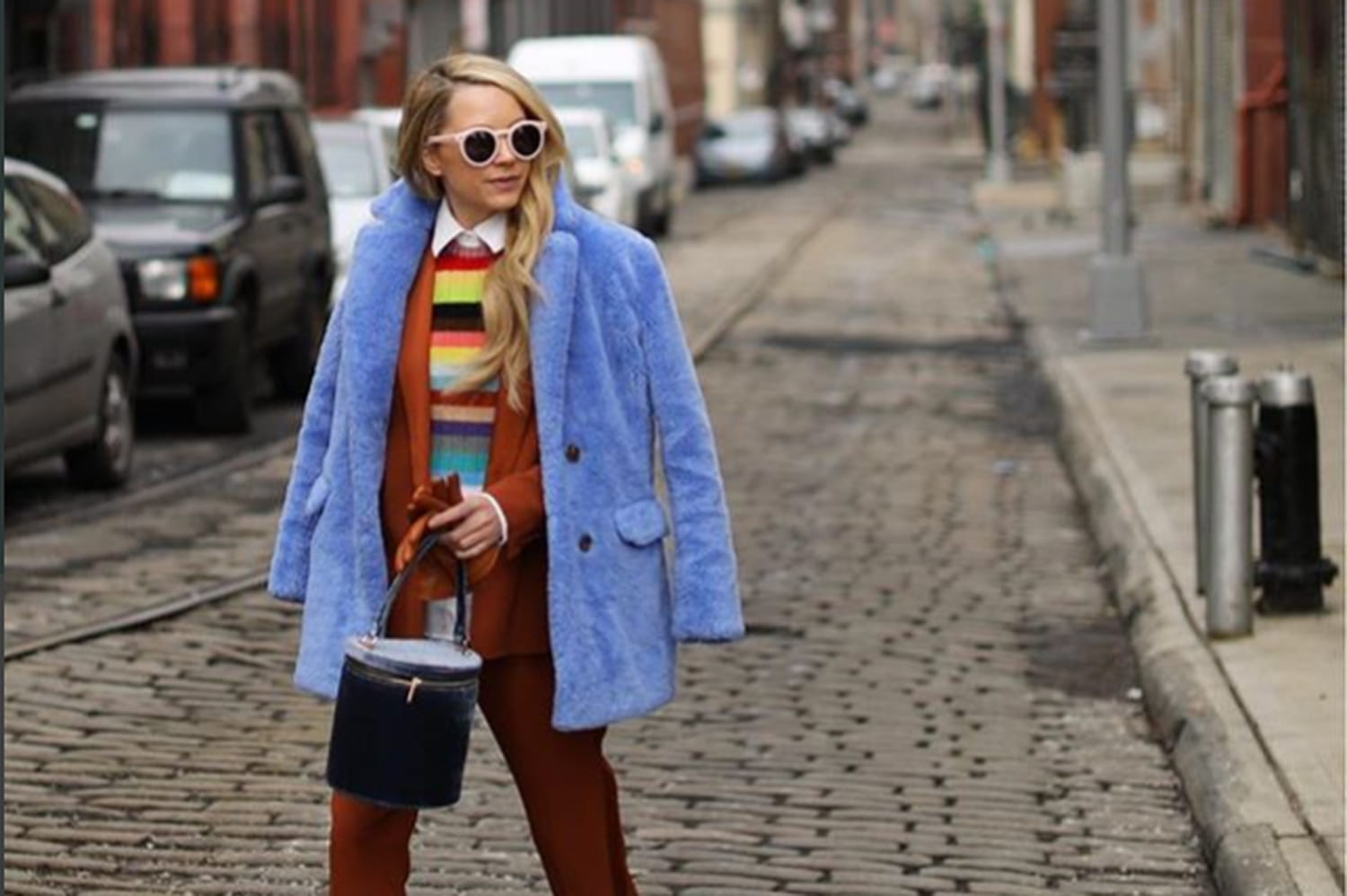 Quand elle bat le pavé de Brooklyn, Blair Eadie ne choisi pas la discrétion. Dans le registre preppy qui la caractérise, elle assemble coupes strictes, références BCBG et tons vitaminés pour un look osé dont on ne saurait contester le bon goût. L'instagrameuse opte pour le smoking écureuil de la collection hivernale de Sézane qu'elle conjugue au mode journée. Grâce à un pull côtelé rayé multicolore Gucci, enfilé sur une classique chemise à col blanc, le tailleur se dévoile sous un autre jour. Mais elle ne s'arrête pas là. Ayant bien révisé ses couleurs, Blair sait que les tons orangés sont complémentaires avec les bleus. Ni une, ni deux, elle associe à son ensemble blazer pantalon une fausse fourrure bleu layette J.Crew et une paire d'escarpins en daim Nine West de la même couleur sans pour autant frôler le ridicule. Une paire de gants et un petit sac rigide en velours achèvent le chic de cette tenue habillée. Sacré flair, blair !