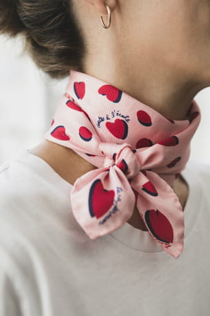 • Quoi : un joli foulard rose à imprimé coeurs rouges