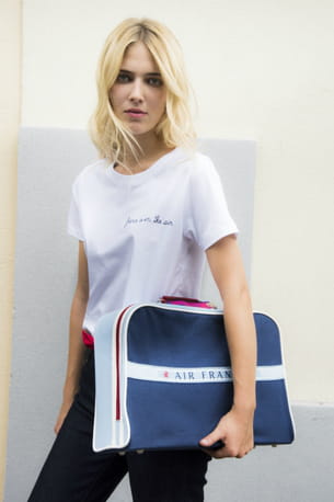 • Quoi : un t-shirt blanc basique brodé en fil bleu du message"France is in the air" et un t-shirt blanc ajusté brodé en fils rouges et bleus du message "Le monde à l'infini" en forme de cœur