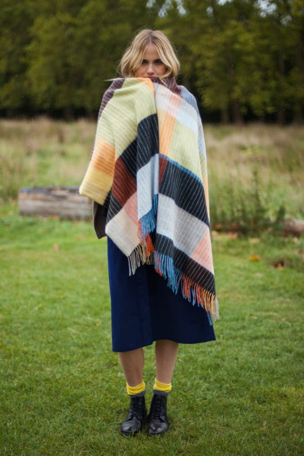 • Quoi : un pull 100% cachemire à motifs géométriques multicolores, une couverture assortie et une écharpe