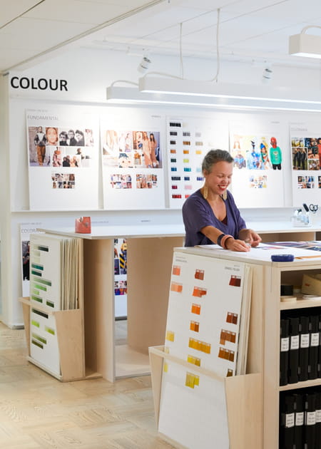 Après avoir traversé un couloir tapissé de mood boards et de visuels d'inspiration, on entre dans la librairie des couleurs, inépuisable palette chromatique pour la marque de prêt-à-porter. Ici sont répertoriés l'intégralité des coloris utilisés par H&M sur des panneaux mais surtout dans des classeurs de nuanciers occupant de nombreuses étagères.
