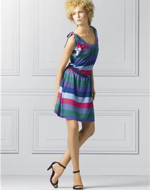 Les rayures sont encore de rigueur cette année. A l'image de cette robe multicolore esprit tee-shirt, dotée de jolis nœuds en guise de bretelles pour dévoiler vos jolies épaules. Pour notre plus grand plaisir, on retrouve les couleurs les plus tendance de l'été, à savoir le rose fuchsia, le vert émeraude, le violet ou encore le bleu quelque peu électrique... Tout pour égayer vos belles journées d'été !