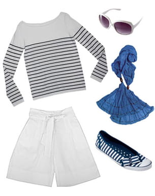 On s'y verrait presque les cheveux dans le vent sur le pont d'un beau bateau ! En tout cas, avec cette tenue à la fois chic et décontractée, vous voici parée pour faire la star. Destination mer oblige, on ne peut omettre de porter du marine et du blanc ! Ce sera chose faite avec ce petit pull en coton dont les rayures sont rappelées jusque dans les ballerines. Le bermuda blanc confère une certaine allure à l'ensemble, tout comme les accessoires, indispensables ! Lunettes mouches et chèche coloré sont autant de détails mode qui feront toute la différence. Vous voici fin prête pour mettre les voiles !