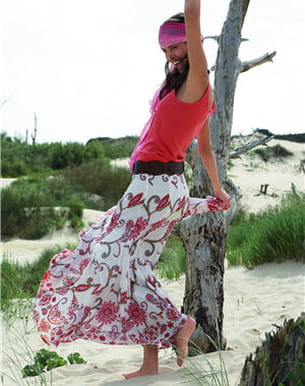 Adoptez le look hippie chic avec cette jupe longue aux imprimés bucoliques et ce petit débardeur coloré pour rester dans les tons. Pour ne pas déroger à la règle de cette tendance ultra branchée cet été, il vous faudra aussi le chèche assorti version tie and tie ! On n'oublie pas non plus la grosse ceinture ornée de petits clous pour harmoniser l'ensemble et le tour est joué !