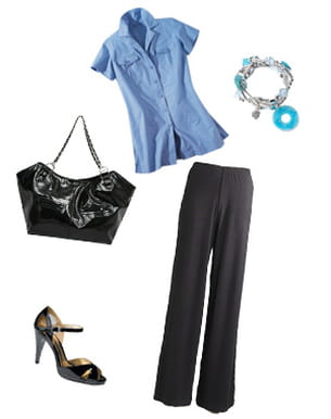 Marie Chaudagne, coach en image personnelle : "Les rondes doivent privilégier les accessoires de grandes tailles et plutôt voyants, ainsi que les talons hauts ou moyens pour élancer la silhouette. Très bon choix par conséquent pour ce sac verni noir, assorti aux chaussures pour plus d'élégance, et ce bracelet, que l'on remarque, dans les couleurs de la chemisette. Le pantalon noir est un basique, notamment au bureau, idéalement de forme droite avec un pli au centre, dans une matière fluide. Il peut être légèrement évasé, sans démesure au risque de tasser votre silhouette. La chemise de couleur permet de porter le regard sur le haut du corps et doit être choisie d'une longueur recouvrant les hanches ; la forme de ses manches, en biais, affine les bras. Attention à ne pas choisir un tissu brillant, que l'on réserve pour les accessoires, puisque le satiné avance les volumes."