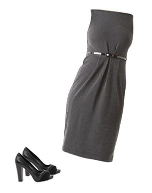 Une jolie robe classique signée Promod, des escarpins hauts perchés noirs d'Erotokritos pour André... Voilà un look à l'élégance intemporelle. On accompagne le tout d'un grand sac noir en journée, une pochette en soirée et le tour est joué !
