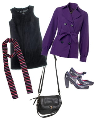 39,95 euros la robe Etam ; 39 euros la veste Mango ; 14,95 euros l'écharpe Xanaka ; 19,95 euros la pochette Etam et 125 euros les chaussures Hush Puppies © DR