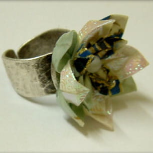 Posée sur un anneau en métal martelé, cette fleur inspirée des origamis séduit grâce à ses délicates couleurs aquatiques. Un bijou imaginé par Les fantaisies de la licorne.