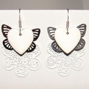 Composées de fleurs et coeurs blancs ainsi que de papillons en argent, ces boucles sont des compositions tout à fait originales. Cette paire de boucles est signée par LG Créations.