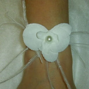 Plumes d'autruche, orchidée et perle blanches composent ce bracelet à porter en soirée ou lors d'un mariage. Cette création a été imaginée par Les fantaisies de guisyl.