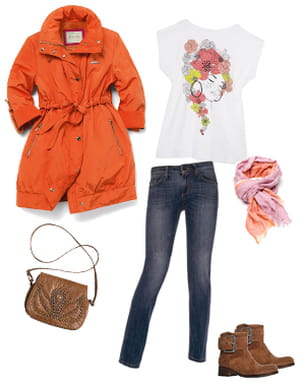 Pour booster votre moral et votre silhouette, optez pour des couleurs vives. Mais attention à bien doser le tout. Ici, la parka orange demande une tenue plus sage. Pour un ensemble confortable, on mise sur un duo jean-tee-shirt et sur quelques accessoires bien pensés.