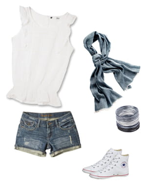 Nichez vous dans le chèche de votre amoureux et vous verrez la vie vous paraîtra bien plus douce. Pour rester dans les tons, jouez sur un haut blanc romantique et un short en jean. Des baskets et des bracelets pour parfaire le look et vous voilà prête à affronter l'été.