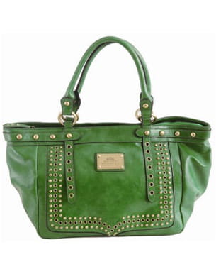 Chez Elite, on ose sans modération la couleur vive, très vive. Preuve en est de ce modèle en similicuir vert orné de clous dorés, à porter si l'on a une tenue sobre toutefois, histoire d'éviter le fashion faux-pas.
