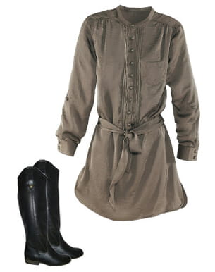La robe se donne un esprit liquette avec ce modèle au coloris taupe très tendance. Flirtant avec le style officier, ce modèle se décline aussi en noir et se porte sur un legging ou un collant opaque. Pour rester dans le même genre, on mise sur des bottes cavalières presque plates et très confortables. Une jolie paire que vous n'allez plus quitter !