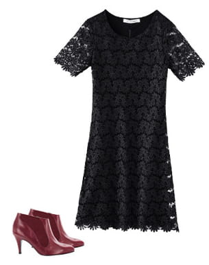 La petite robe noire se pare de dentelle pour un effet rétro-chic. Un style idéal à adopter du bureau jusqu'en soirée pour être élégante du matin au soir. Pour créer une silhouette originale et casser le côté stricte de la robe unie, on parie sur des low-boots dont le coloris rouge profond s'impose et se fera remarquer. Un duo inattendu mais efficace !